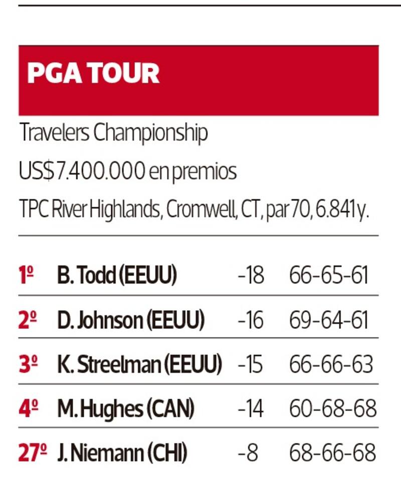 Al final de la vuelta, Niemann no se movió nada de la ubicación en que había iniciado la ronda: quedó 27º con ocho bajo el par de campo, a 10 golpes del líder, el local Brendon Todd, con -18.