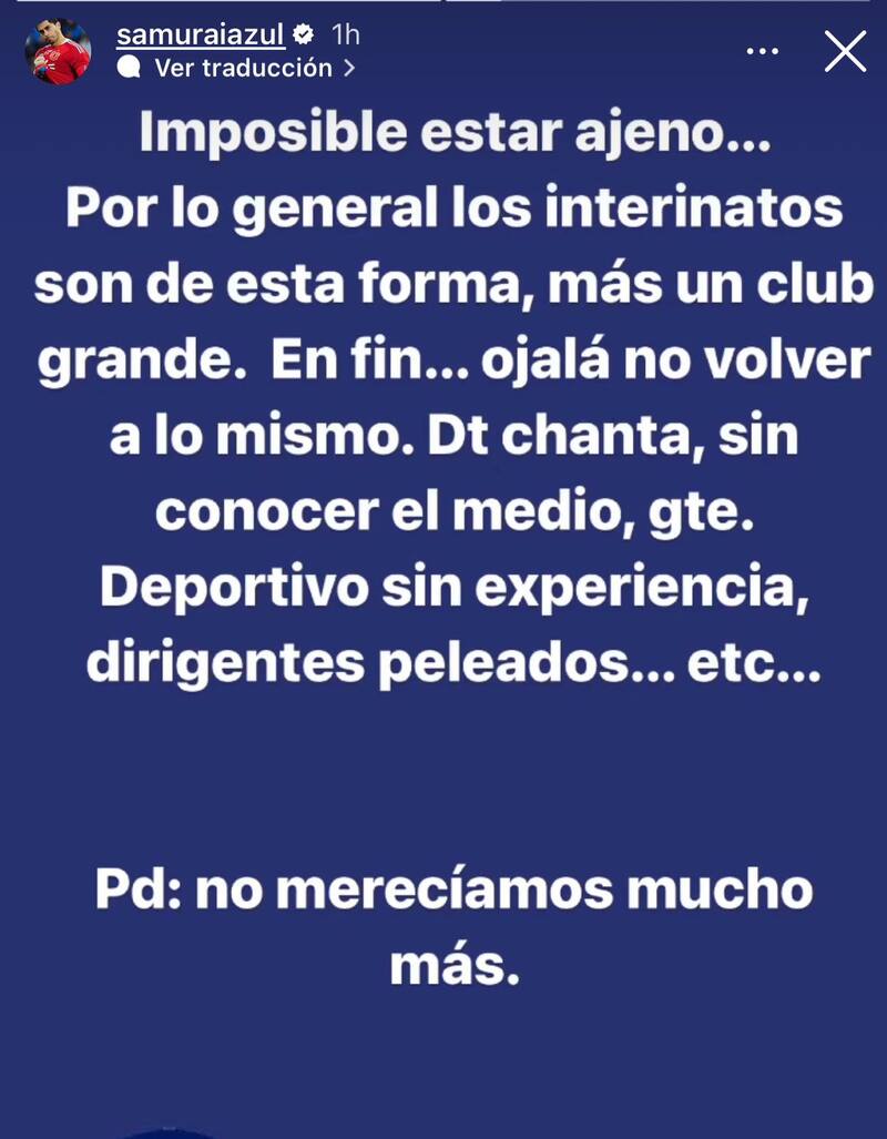 “Imposible estar ajeno... Por lo general los interinatos son de esta forma, más en un club grande. En Fin... ojalá no volver a lo mismo. DT chanta, sin conocer el medio, gerente deportivo sin experiencia, dirigentes peleados, etc”, compartió a través de una historia en su cuenta de Instagram.