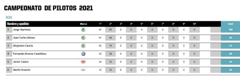 Jorge Martínez es puntero en su categoría en la RC2A, con 106 puntos, al volante de su Škoda. Lo sigue Juan Carlos Alonso, con 85 puntos. El chileno es uno de los favoritos para llevarse esta fecha. Sueña con ser el primer chileno que gana el Rally de Argentina.