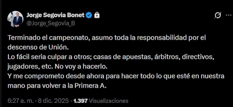 A través de un mensaje escrito, el dueño del club asumió el revés. “Terminado el campeonato, asumo toda la responsabilidad por el descenso de Unión. Lo fácil sería culpar a otros; casas de apuestas, árbitros, directivos, jugadores… No voy a hacerlo”, afirmó en su cuenta de X.