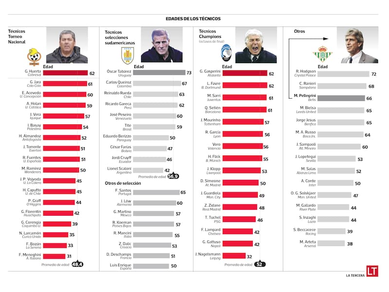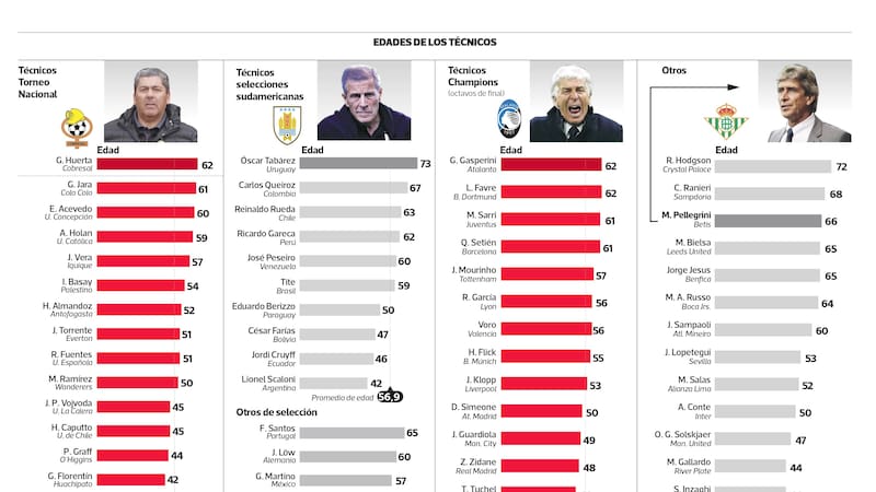 El promedio de los seleccionadores sudamericanos es de 56,9 años, 4,9 más que el promedio de los entrenadores de los clubes que accedieron a octavos de final de la Champions. La primera línea europea ronda los 50 (ver infografía).