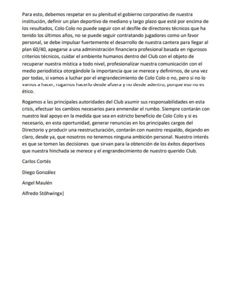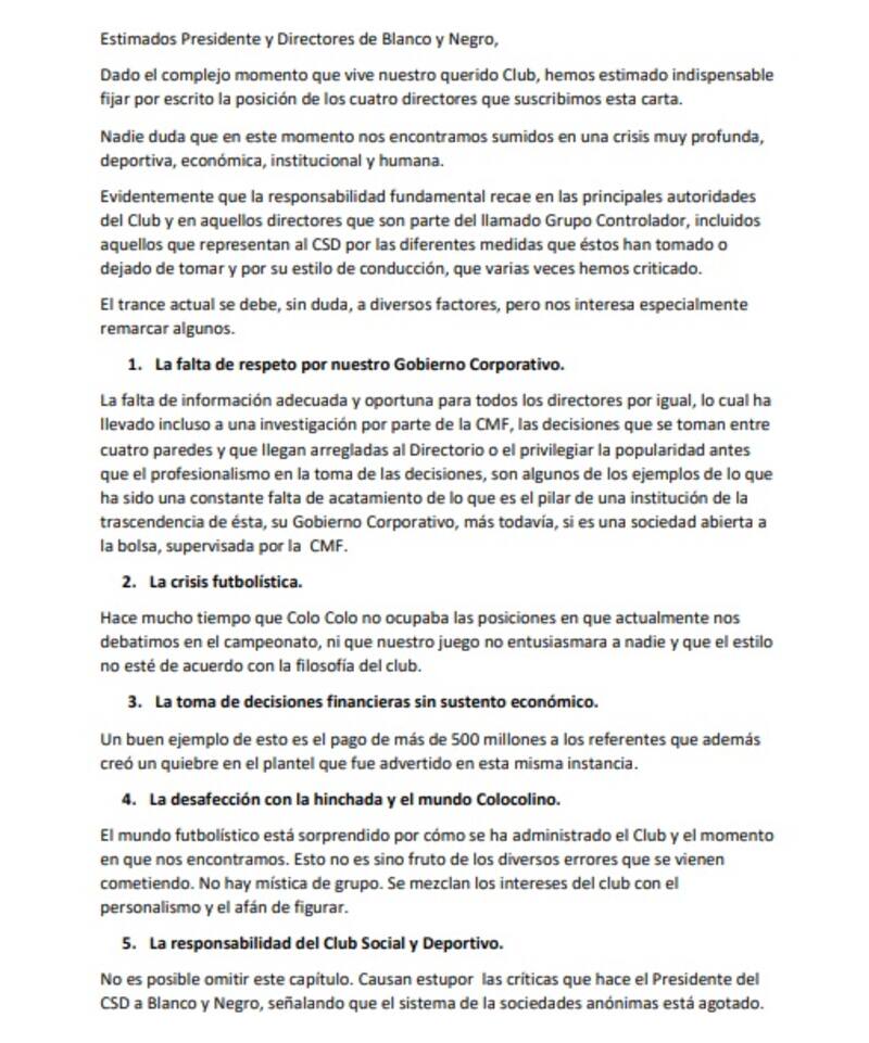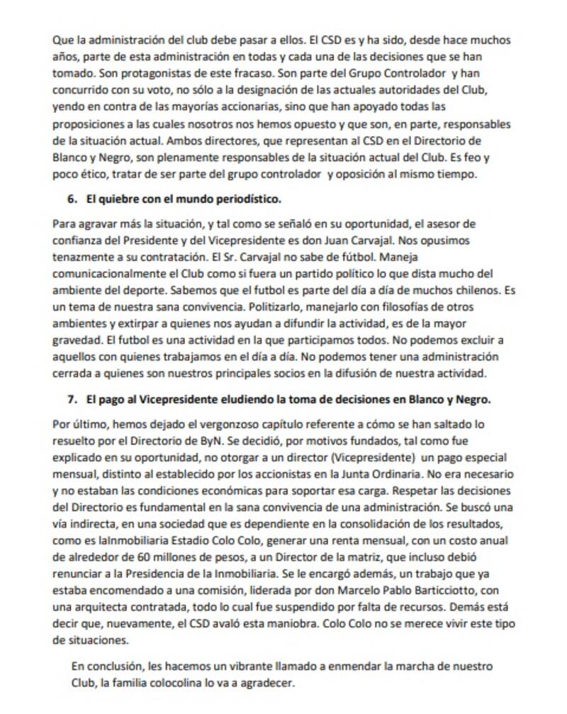 A continuación señala que el trance del Cacique se debe a diversos factores y remarcan “la falta de respeto por nuestro Gobierno Corporativo, la crisis futbolística, la toma de decisiones financieras sin sustento económico, la desafección de la hinchada y el mundo colocolino, la responsabilidad del club social y deportivo, el quiebre con el mundo periodístico y el pago al vicepresidente eludiendo la toma de decisiones en Blanco y Negro".