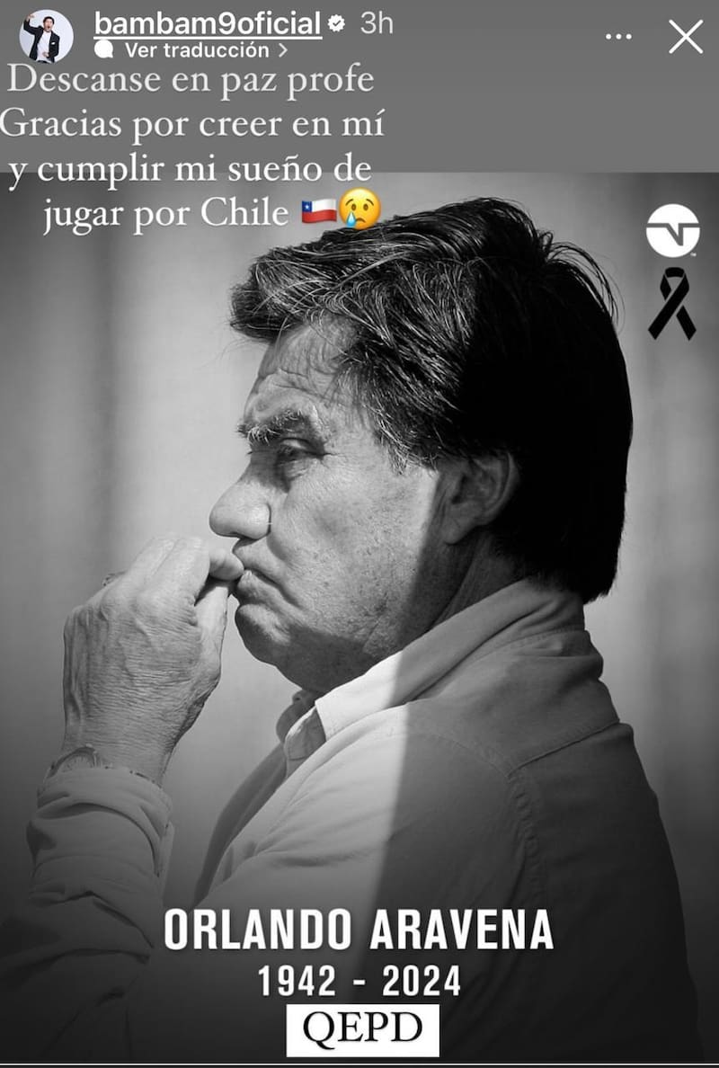 Bam Bam utilizó su cuenta de Instagram para despedir al seleccionador. “Descanse en paz profe”, comenzó diciendo en una de sus historias. Posteriormente le envió palabras de agradecimiento por ser el primer DT en poner sus ojos en él y llevarlo al otro lado de la cordillera para que represente al país en un torneo oficial de nivel adulto por primera vez. “Gracias por creer en mí y cumplir mi suelo de jugar por Chile”, seguido de una bandera chilena y el emoji de una cara triste con una lágrima en sus mejillas.