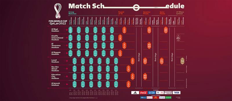 De acuerdo al esquema presentado por la organización que preside Gianni Infantino, el primer partido se jugará en el estadio Al Bayt, con capacidad para 60 mil personas. Una de las variantes importantes es que la fase grupal se disputará ahora en 12 días, con la finalidad de permitir la mejor recuperación de los equipos participantes. La final se jugará en el estadio Lusail, con aforo para 80 mil espectadores.