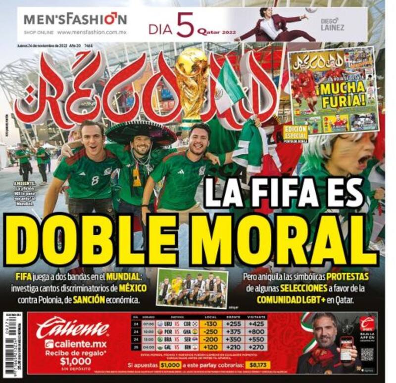 “La FIFA es doble moral”, titula el diario deportivo Record, uno de las más importantes publicaciones deportivas en el país azteca. La explicación viene en la portada. “FIFA juega a dos bandas en el Mundial: investiga cánticos discriminatorios de México contra Polonia. La sanción es económica”, puntualiza una de sus bajadas.
