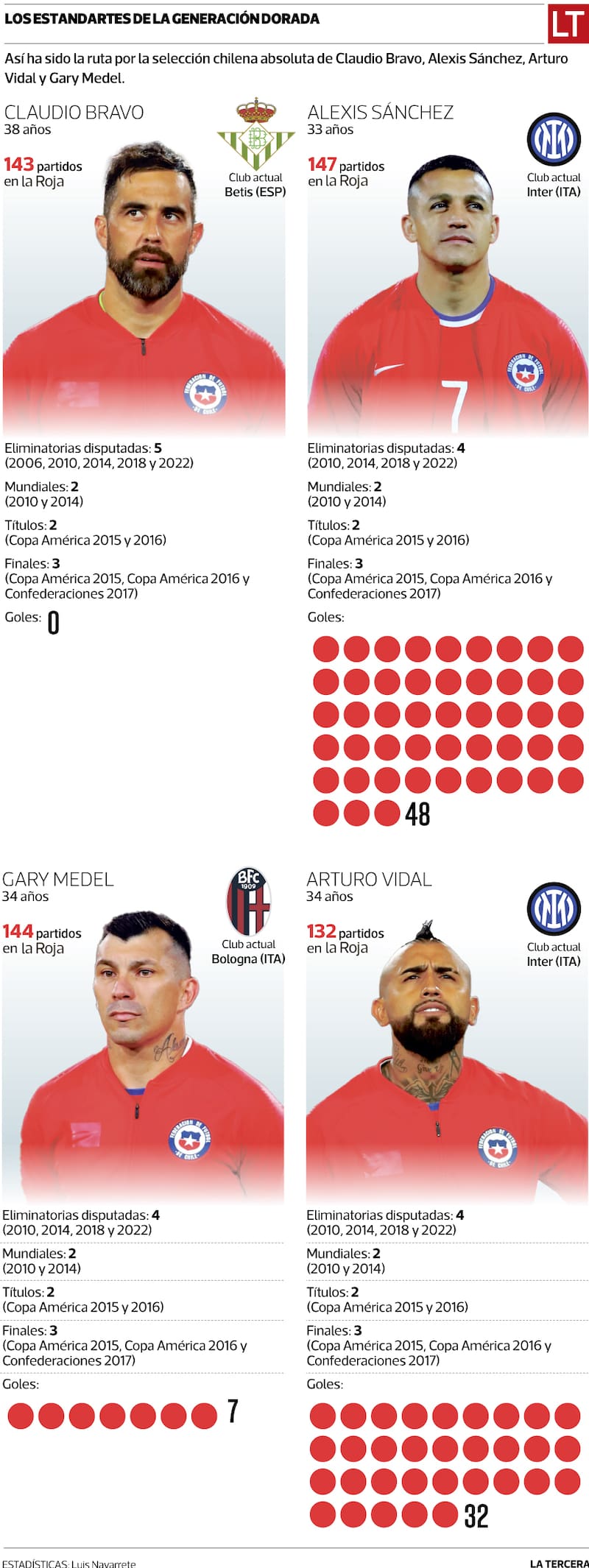 Sea cual sea el devenir, los apellidos de los consagrados (así como otros) quedaron instalados en la página dorada del fútbol nacional. Además de lo que significó la consagración de las Copas América, los integrantes de este equipo se encargaron de romper cualquier marca existente en el seleccionado chileno. Solo un dato: entre los cuatro suman 566 presencias en la Selección. Los tres jugadores con más partidos en la Roja absoluta son Alexis (147), Medel (144) y Bravo (143). Vidal está quinto (132), siendo superado por Mauricio Isla, que se cuela cuarto (135). Los nueve con más juegos son de esta generación.
