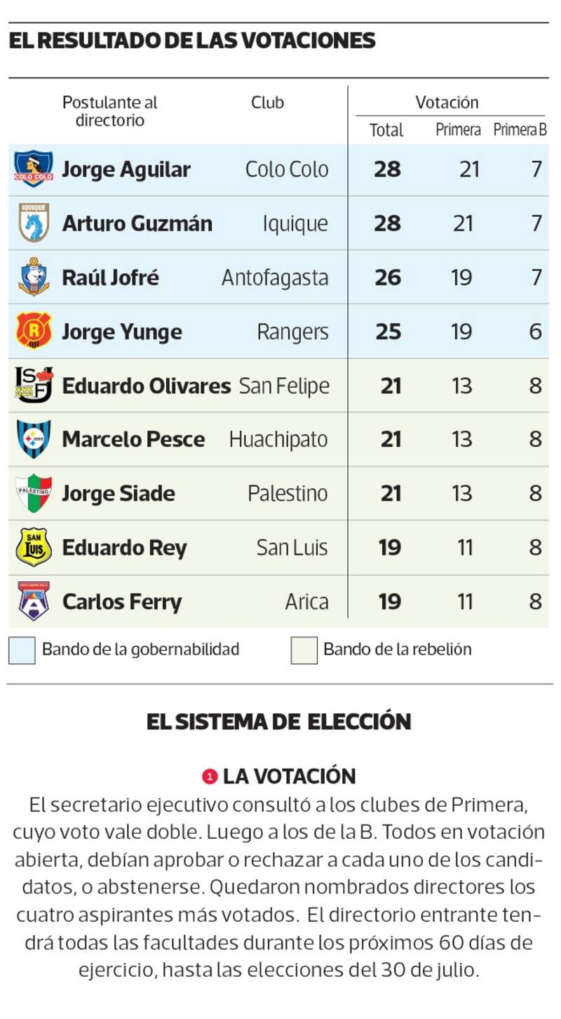 Ya superado ese punto, se ratificó que la futura elección será el próximo 30 de julio. Ese mismo día, el timonel dejará su cargo oficialmente, al igual que Marcos Kaplún y el directorio de transición. Justamente, fue la Gobernabilidad la que impuso sus cuatros candidatos ante los cinco de la Rebelión: Jorge Aguilar (28 votos), Arturo Guzmán (28), Raúl Jofré (26) y Jorge Yunge (25) fueron elegidos por mayoría absoluta. Eduardo Olivares (21), Marcelo Pesce (21), Jorge Siade (21), Carlos Ferry (19) y Eduardo Rey (19) no lograron el piso de 25 preferencias. La primera reunión de la nueva mesa será hoy.