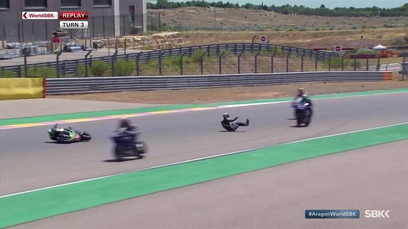 Se corría la vuelta 14 de la primera carrera del fin de semana en Aragón, por el Mundial de Superbike, cuando el británico Alex Lowes protagonizó la acción más sorprendente de la jornada. El piloto se salvó de milagro tras caer de su Kawasaki y deslizarse por la pista, mientras los demás competidores pasaban a toda velocidad por el lado.