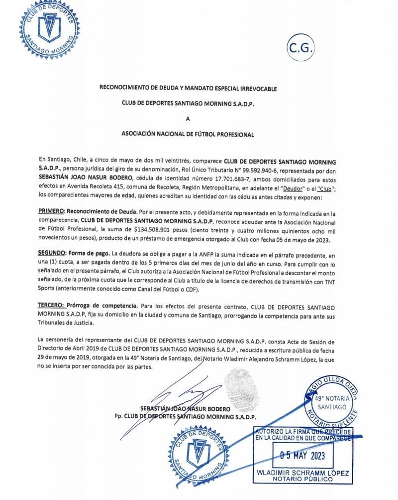 El Chago recibió $ 134.508.901. Así consta en el reconocimiento de deuda que la entidad que preside Sebastián Nasur suscribió ante el notario público Wladimir Schramm, el viernes 5 de mayo. Lo llamativo es que el club autobusero se compromete en el acto a restituir el dinero en una cuota, pagadera dentro de los cinco primeros días de junio de este año. Como garantía de la transacción, autoriza a la ANFP a descontar el dinero de la próxima cuota que deba percibir el club a cuenta de los derechos de transmisión.