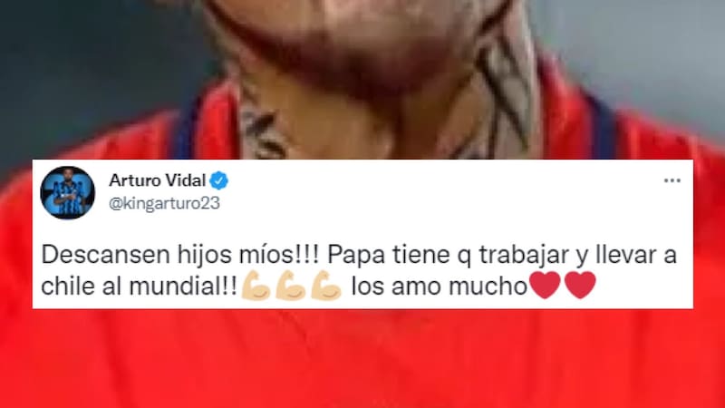 El medio TyC Sports recordó un tweet del Rey Arturo, que data de 2017, y en el que prometía a sus hijos trabajar para llevar a la Selección al Mundial de Rusia. “Descansen hijos míos, papá tiene que trabajar y llevar a Chile al Mundial. Los amo mucho”, había escrito en ese momento el actual jugador del Inter de Milán.