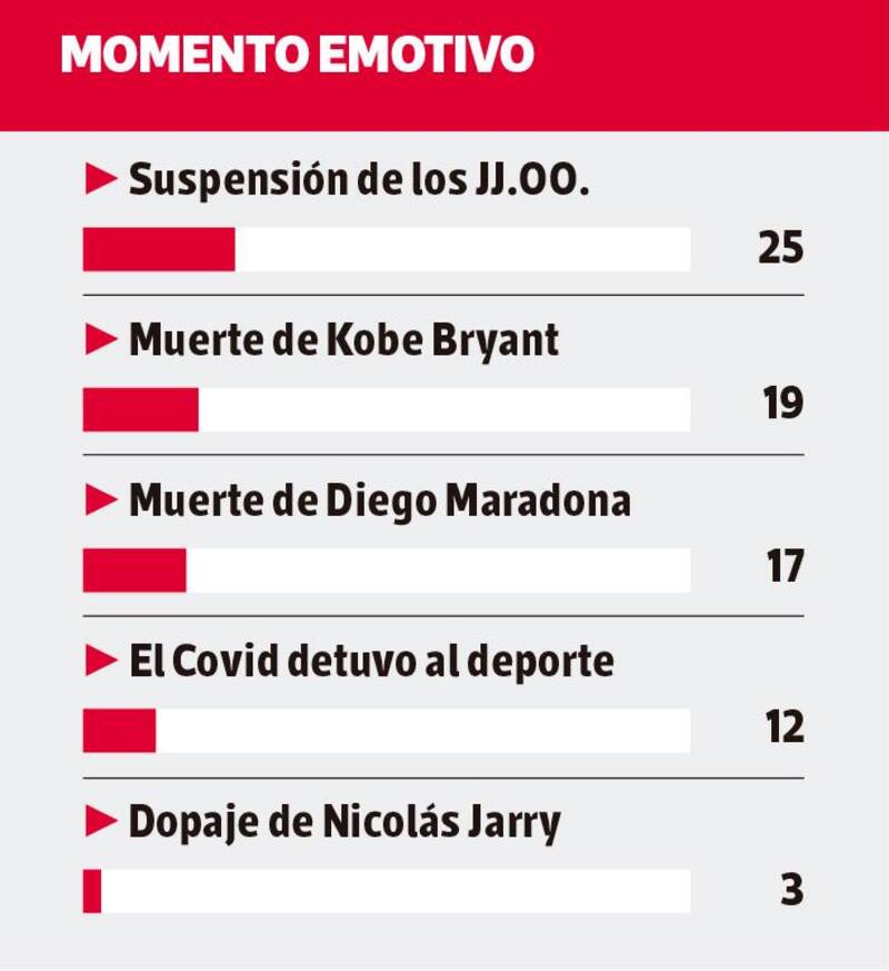Pero no fue lo único, pues los fallecimientos golpearon fuerte a los deportistas nacionales, porque las pérdidas de Bryant, Diego Maradona, Marlene Ahrens, Carlos Campos y de deportistas en general completan el 39% de las respuestas. Este 2020 será un año que no se olvidará.