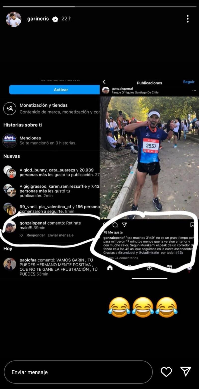 El usuario @gonzapenaf le comentó, sin mayores vacilaciones, “Retírate malo!!!”. El competidor no le escribió nada al respecto, pero decidió subir un pantallazo de una foto del tipo que lo atacaba, donde este destacaba su marca en un maratón. Garin, mediante su cuenta @garincris, solo realizó el posteo con tres emoticones de una cara riendo, dando a entender que la persona quien le comenta está lejos del alto rendimiento.
