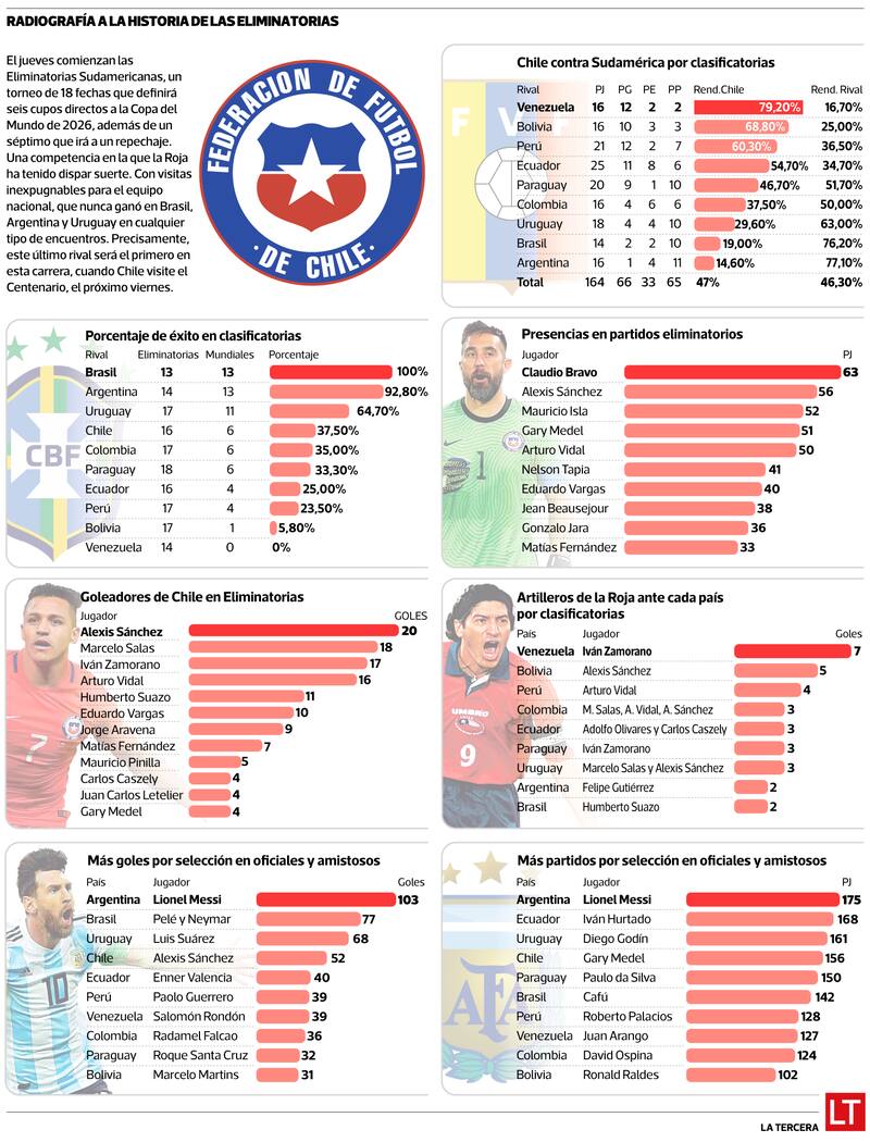 Una competición que ha tenido muchas más sombras que luces para la selección chilena en la historia. Sin ir tan lejos, el equipo nacional, con Generación Dorada en su esplendor, no pudo llegar a los dos últimos Mundiales. El cuadro que hoy dirige Eduardo Berizzo ha disputado 16 clasificatorias propiamente tal, desde que se iniciaron oficialmente los procesos para el Mundial de Suecia 1958. Apenas en seis ocasiones logró clasificar; la última para Brasil 2014.