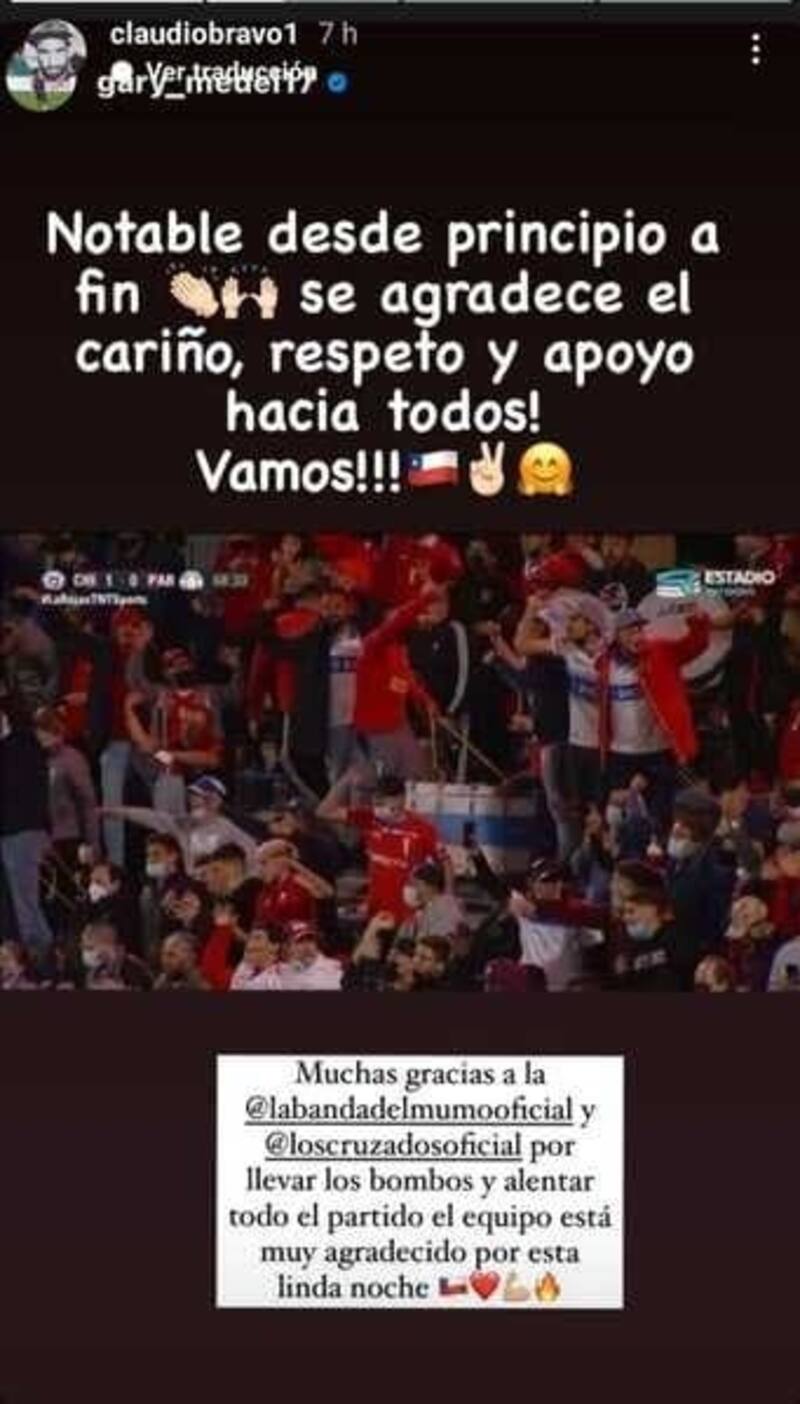 “Muchas gracias a La Banda del Mumo y a la barra de Los Cruzados por llevar los bombos y alentar todo el partido. El equipo está muy agradecido por esta linda noche”, publicó Gary Medel en su cuenta de Instagram, luego del revitalizador triunfo de la selección chilena sobre Paraguay, en San Carlos de Apoquindo, la noche del domingo.