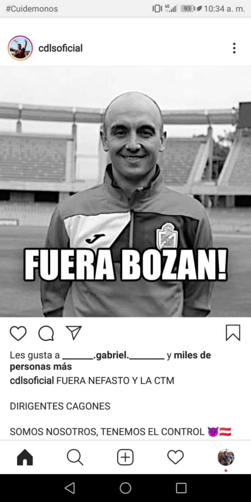 El resto de los ataques va en el mismo sentido. “Fuera Bozán” es la leyenda que aparece en una imagen del entrenador posando en el estadio La Portada.