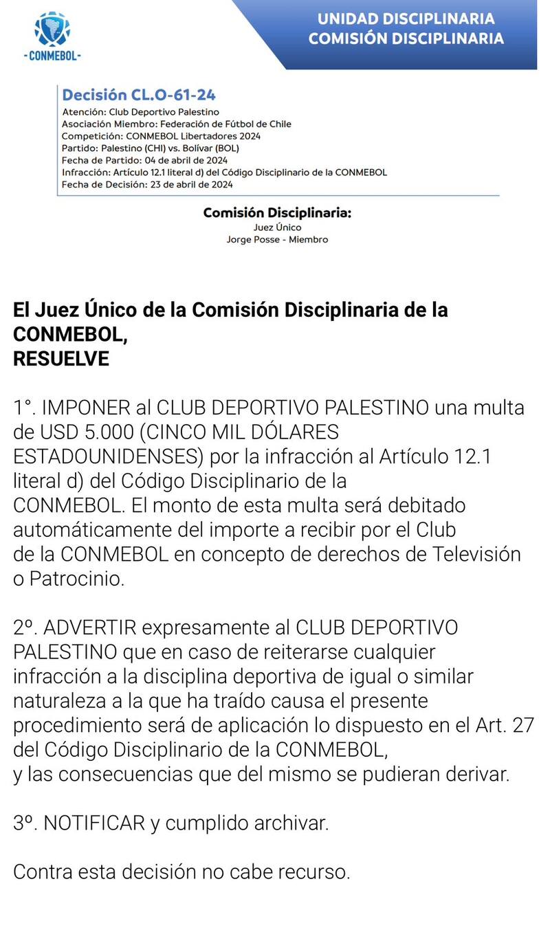 La resolución del juez único de la Comisión Disciplinaria de la entidad resolvió lo siguiente: “Imponer al CLUB DEPORTIVO PALESTINO una multa de USD 5.000 (CINCO MIL DÓLARES ESTADOUNIDENSES) por la infracción al Artículo 12.1 literal d) del Código Disciplinario de la CONMEBOL. El monto de esta multa será debitado automáticamente del importe a recibir por el Club de la CONMEBOL en concepto de derechos de Televisión o Patrocinio”.