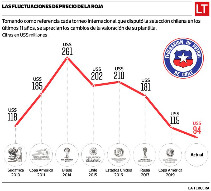En Sudáfrica 2010, el plantel de la Roja costaba 118 millones de dólares. Desde esa fecha, el precio máximo de la plantilla chilena llegó a un precio máximo de US$ 210 millones en la Copa Centenario 2016, tras el segundo título del equipo. Hoy, los seleccionados nacionales suman 94 millones de dólares entre los pases del plantel, menos de un 80% de la tasación obtenida hace ya más de 11 años.