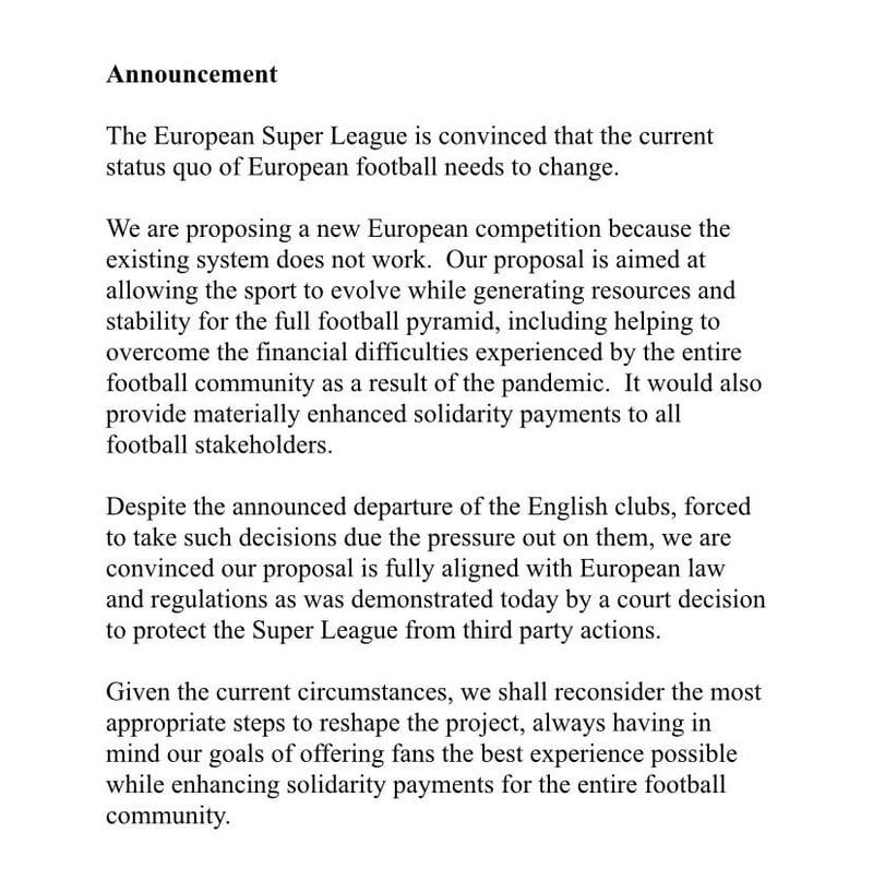 En un comunicado, la organización que preside Florentino Pérez, también timonel del Real Madrid, acusó presiones externas que derivaron en la salida de los seis clubes ingleses que la integraban y que obligan a replantearse ciertos asuntos. "Estamos convencidos de que el sistema de status quo del fútbol europeo necesita cambiar", insiste el escrito.