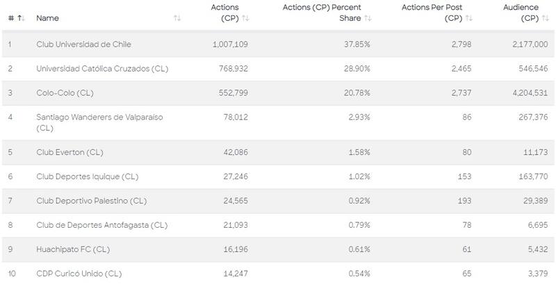 En ese sentido, el Romántico Viajero fue el único equipo que superó el millón de acciones de sus seguidores, con 1.007.109. En cada uno de sus posteos interactuaron en promedio 2.798 veces y su audiencia total llega a 2.177.000 de personas. Aún así, Colo Colo es el que tiene mayor audiencia en redes sociales, con 4.204.531 y tercera la UC, con 546.546.