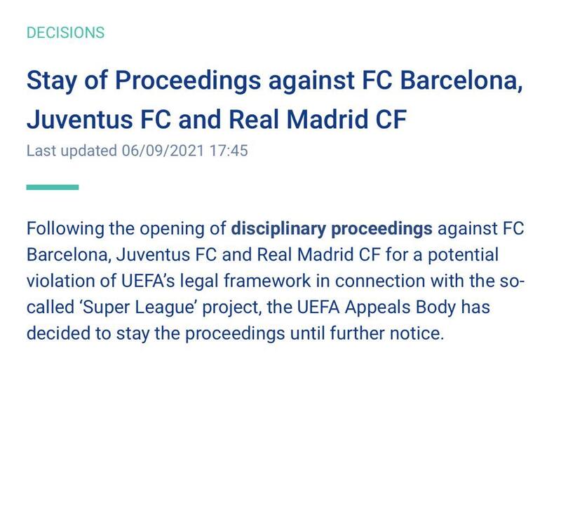 Por Christian GonzálezLa UEFA suspende el procedimiento disciplinario contra el Real Madrid, el Barcelona y la Juventus por la Superliga