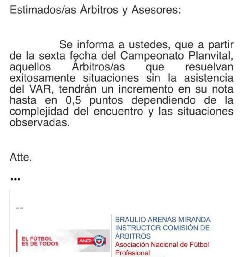 A través de una carta indicó que “se informa a ustedes, que a partir de la sexta fecha del Campeonato Planvital, aquellos árbitros/as que resuelvan exitosamente situaciones sin la asistencia del VAR, tendrán un incremento en su nota hasta en 0,5 puntos dependiendo de la complejidad del encuentro y las situaciones observadas”.