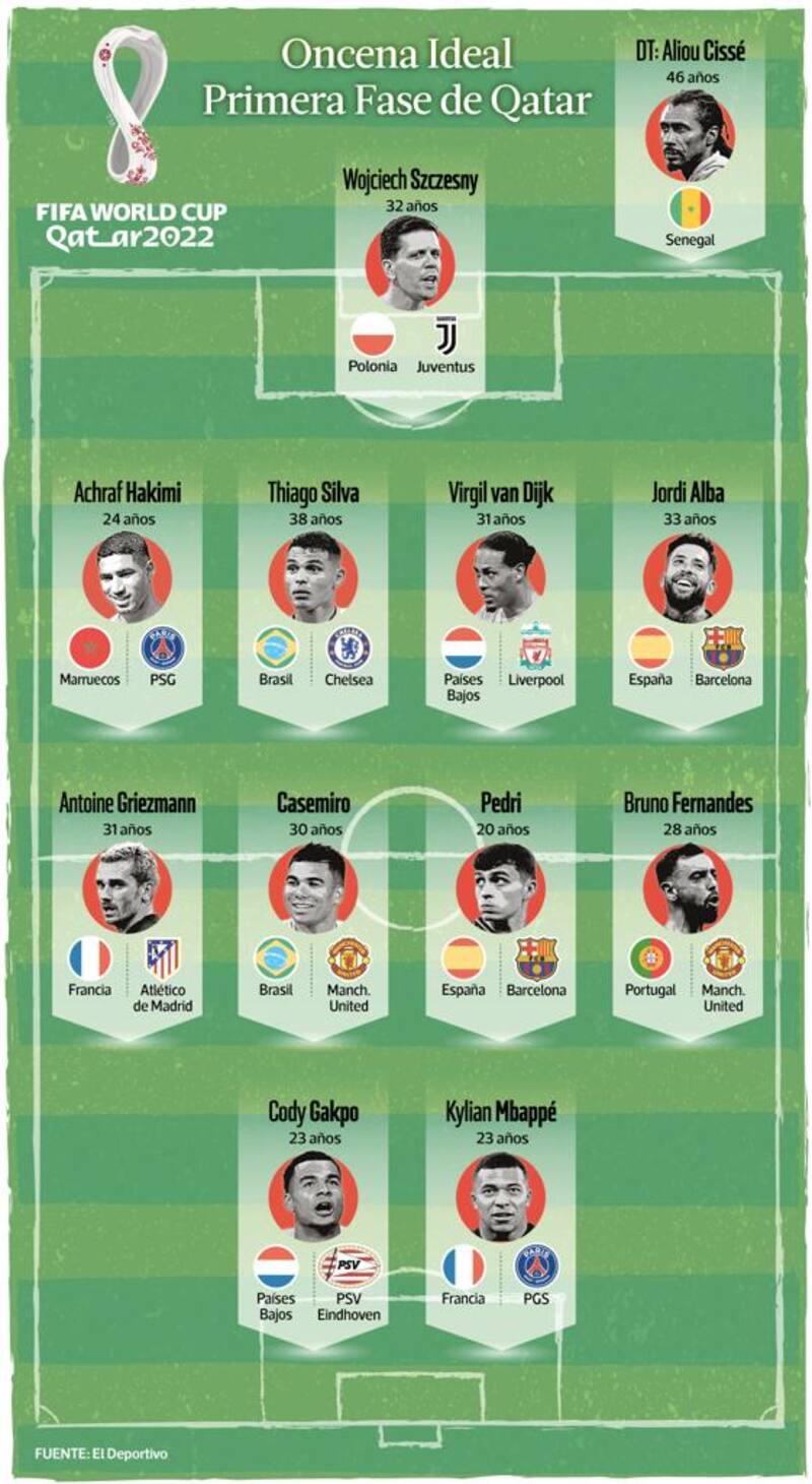 Delante suyo, en una escuadra de marcada vocación ofensiva, las opciones tienen igual o más jerarquía. Con Marruecos convertido en una de las revelaciones del torneo, en una denominación que responde a la historia futbolística del país africano más que a la actualidad de sus figuras, es impensable no incluir en la banda derecha a Achraf Hakimi. Alto acierto en los pases y vocación para buscar el arco a través de remates, precisamente, uno de los argumentos más escasos en el Mundial, le valen el puesto. Por la otra franja, un histórico. Jordi Alba confirma por qué sigue siendo inamovible en España y en el Barcelona. 175 cesiones de balón, un remate, tres ocasiones creadas y dos asistencias resumen la faena del dueño de la banda izquierda. En el centro de la defensa, otra vez, dos gigantes. A los 38 años, el brasileño Thiago Silva sigue siendo una pieza de garantía. A su solvencia aérea, suma una óptima distribución del balón. Ya ha completado 158 pases y ha generado una ocasión de gol. A su lado, jugaría el neerlandés Virgil van Dijk, otra garantía de solidez y, también, de un inicio óptimo de la elaboración: ya registra 209 pases. Y, tal como en el Liverpool, se da maña para pasar al ataque. Lo reflejan los dos tiros que ha intentado.