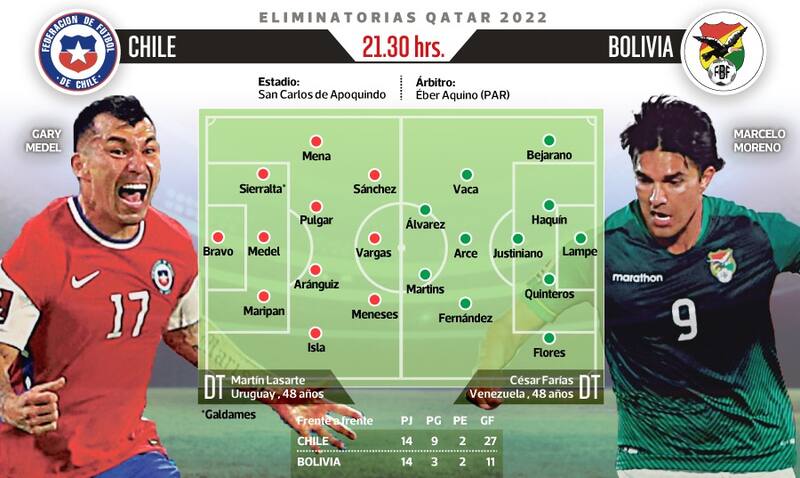 Chile enfrenta a Bolivia esta noche, a las 21.30, en San Carlos de Apoquindo, un encuentro trascendental en las aspiraciones nacionales de clasificar al Mundial de Qatar 2022. Para ello, el equipo que dirige Martín Lasarte deberá doblegar a un rival que llega motivado tras la victoria 3-1 ante Venezuela, como local. La Selección, por su parte, también atraviesa un buen momento anímico después de rescatar un empate 1-1 en su visita a Argentina.