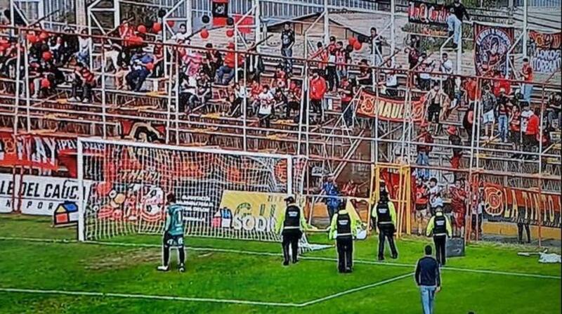 Cuando se cumplían los 67′, alrededor de cinco fanáticos de la R destruyeron el candado que daba hacia el arco sur del reducto sanfelipeño e ingresaron al campo de juego. Allí, encararon al portero y capitán piducano Yair Bonnin, quien se llevó la mayor parte de los insultos.