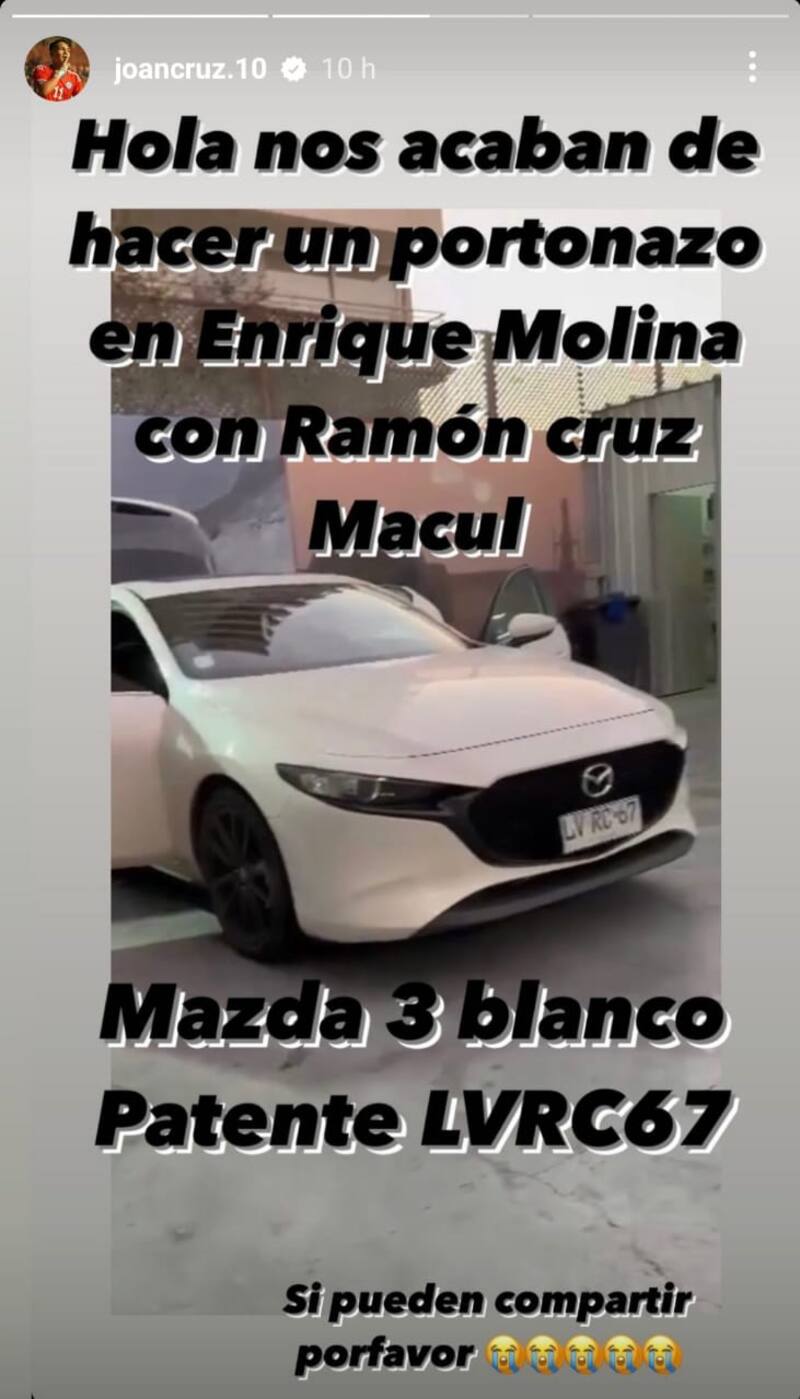 Tras lo ocurrido, Joan Cruz informó en su Instagram parte de lo sucedido, en donde compartió una imagen del vehículo robado acompañado de un texto: “Hola, nos acaban de hacer un portonazo en las calles Enrique Molina con Ramón Cruz, Macul. Mazda 3 blanco, patente LVRC67. Si pueden por favor compartir”.