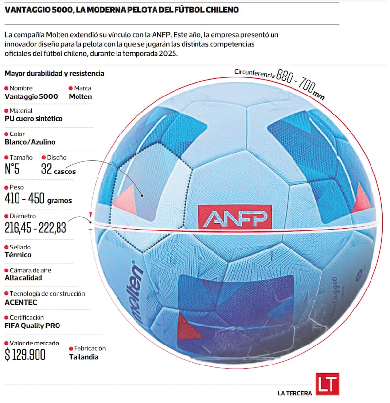 Por cuarta temporada al hilo, es la marca Molten la encargada de fabricar la esférica con la que se disputan los partidos del torneo local. En esa ocasión se trata del modelo Vantaggio F5N5000. Un diseño que ya fue estrenado. “Renovamos el acuerdo, el contrato que tenemos con la ANFP, desde el 2022, por dos años más, hasta el 2026. Vamos a perpetrar cinco años siendo el balón oficial en todas las categorías”, explica Marcelo Meyer, representante de la compañía en Chile a El Deportivo.
