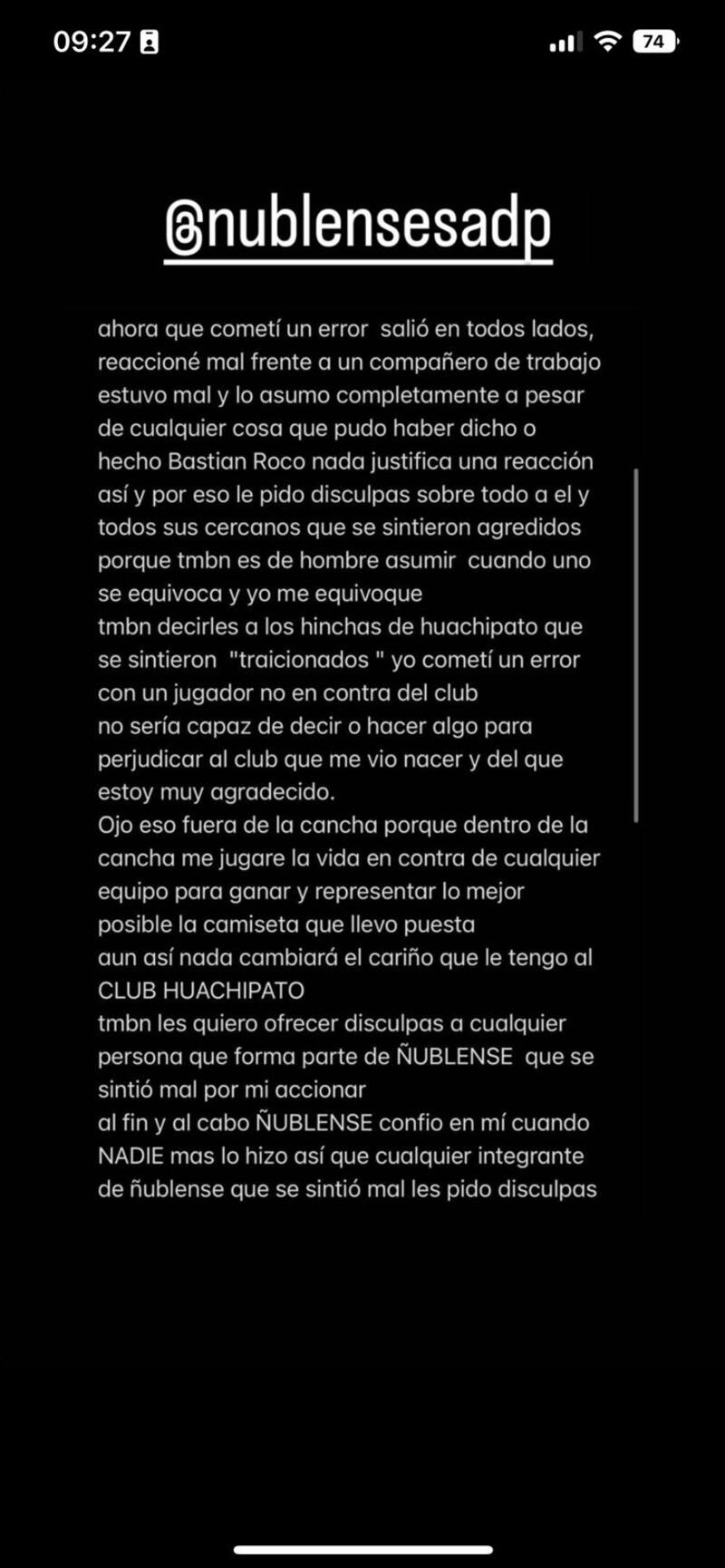 Luego comienza a relatar lo ocurrido tras el partido y ofrecer las disculpas correspondientes. “Ahora que cometí un error salió en todos lados. Reaccioné mal frente a un compañero de trabajo. Estuvo mal y lo asumo completamente a pesar de cualquier cosa que pudo haber dicho o hecho Bastián Roco. Nada justifica una reacción así y por eso le pido disculpas sobre todo a él y a todos sus cercanos que se sintieron agredidos, porque también es de hombre asumir cuando uno se equivoca y yo me equivoqué”.