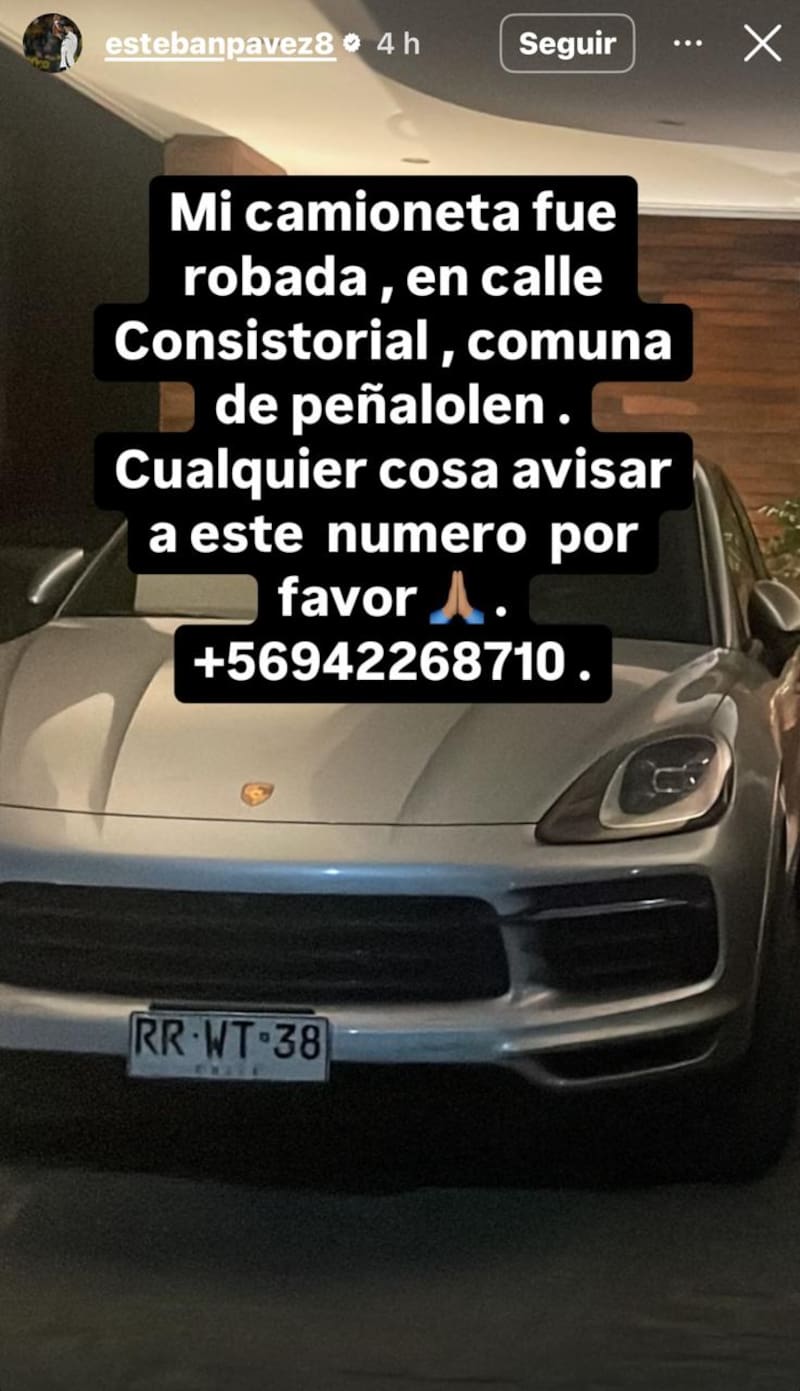 “Mi camioneta fue robada en calle Consistorial, comuna de Peñalolén. Cualquier cosa avisar a este número por favor”, escribió el Capitán de Colo Colo en su cuenta de Instagram. En el vehículo se encontraba su esposa, quien iba manejando, y su hija que iba en el asiento de atrás, la camioneta es una Porsche Cayenne y el asalto fue realizado en la comuna de Peñalolén.