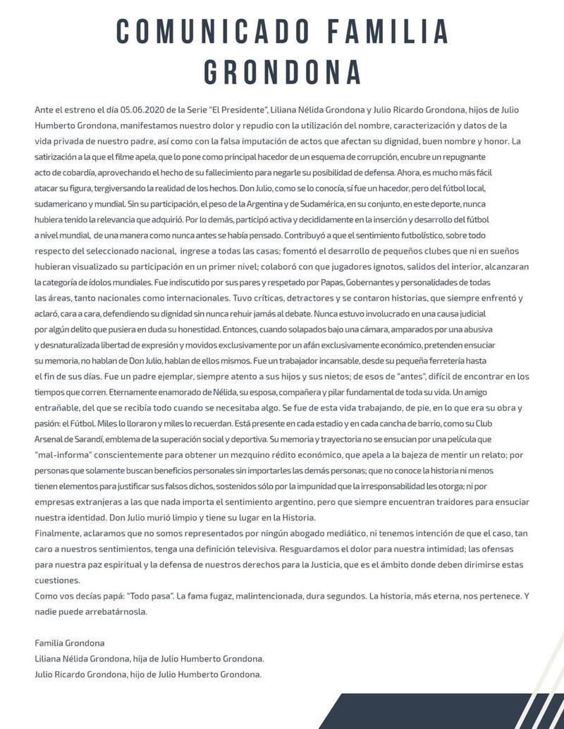 “Manifestamos nuestro dolor y repudio con la utilización del nombre, caracterización y datos de la vida privada de nuestro padre, así como con la falsa imputación de actos que afectan su dignidad, buen nombre y honor. La satirización a la que el filme apela, que lo pone como principal hacedor de un esquema de corrupción, encubre un repugnante acto de cobardía, aprovechando el hecho de su fallecimiento para negarle su posibilidad de defensa”. Así comienza la nota de los hijos de Grondona.