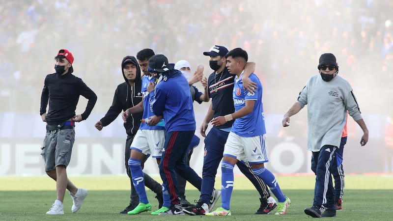 En la derrota ante Universidad Católica, las imágenes de la transmisión oficial fueron lapidarias para los azules. Se vio a un fanático hincha de la U pegándole una patada voladora a un guardia, que lo dejó en el piso. Antes, ya habían dañado el Memorial de los Detenidos Desaparecidos. En tanto, durante la invasión, que obligó a los futbolistas a salir rápidamente del campo de juego, la situación estuvo cerca de pasar a mayores. A Luciano Aued, un hincha de la U le pegó un puntapié. El argentino no reaccionó y solo atinó a apurar su recorrido. Yonathan Andía, en tanto, es encarado con por un fanático, con el que incluso se da unos empujones. El mismo hincha después tiene un entrevero con Ronnie Fernández, con quien finalmente termina dándose la mano.