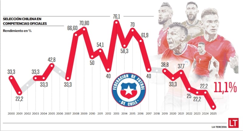 De ninguna manera es antojadizo concluir que la Selección está en uno de los peores momentos de su historia. Es más, en términos estadísticos, el equipo nacional firmó el peor registro de este siglo en un año calendario. El último puesto en las Eliminatorias era, desde ya, algo ignominioso. Sin embargo, el análisis más profundo de la Roja en competencias oficiales es más que preocupante. Sin contar los amistosos Clase A, que de alguna manera pueden alterar las cuentas dependiendo de los rivales, Chile solo obtuvo 2 de los 18 puntos que disputó durante 2025.