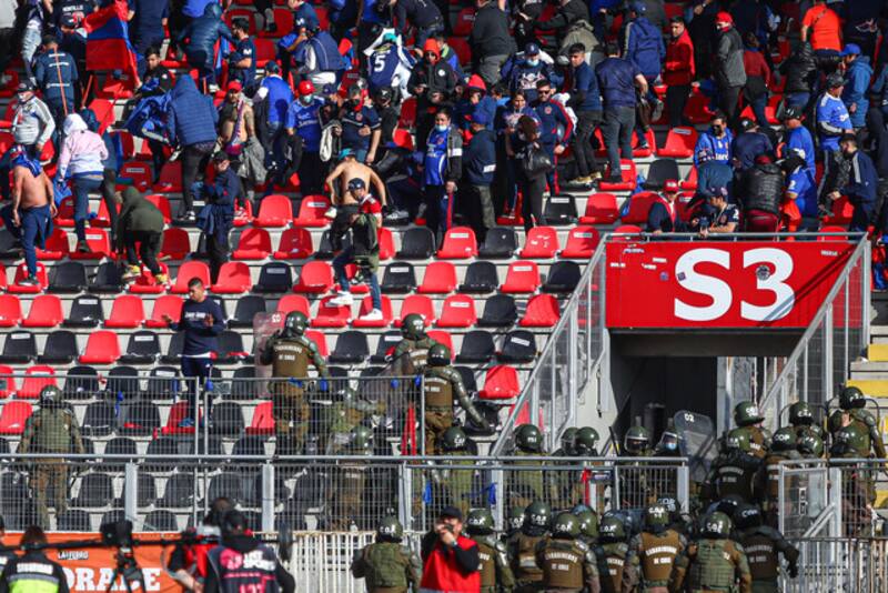 Luego, sumidos por la frustración, hinchas azules comenzaron a romper y destrozar parte del Fiscal de Talca. En ese contexto fue cuando Carabineros tuvo que intervenir para disgregar a parte del público laico que se encontraba empujando las rejas y rompiendo el mobiliario del recinto. Hechos lamentables que se vuelven a repetir por parte de la hinchada que hizo de local en Talca, y que empañan todo el espectáculo que supone un partido como este.