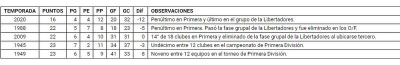 La peor ubicación histórica del Cacique en un torneo terminado es el penúltimo puesto en 1945. Ese año fue undécimo entre 12 equipos.