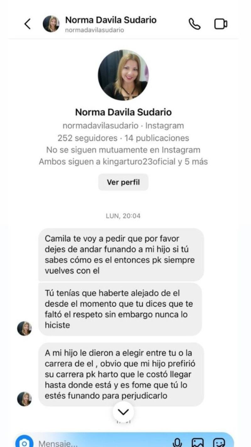 “Camila, te voy a pedir que por favor dejes de andar funando a mi hijo. Si tú sabes cómo es él entonces por qué siempre vuelves con él. Tenías que haberte alejado desde el momento que te faltó el respeto. Sin embargo, nunca lo hiciste. A mi hijo le dieron a elegir entre tú y su carrera. Obvio que eligió su carrera”, señala uno de los mensajes.