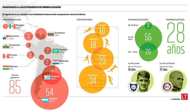¿Cómo está integrada la legión foránea que copa el campeonato nacional? El Deportivo realizó el catastro: hay 85 futbolistas, de los cuales más del 60% son transandinos. Además, del total, 34 son atacantes. El promedio de edad es de 28 años.