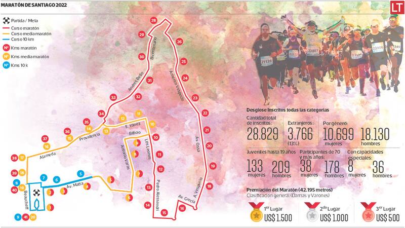 Otros de los hechos más llamativos para este 2022 es la gran cantidad de extranjeros que disputarán la etapa. Un 13% de los inscritos (3.766) son nacidos en otro país, destacando Venezuela (1.458), Brasil (762) y Colombia (247). Incluso, participantes africanos llegaron a competir. Desde Kenia, la mayor potencia mundial de corredores de largas distancias, vendrán Kirwa Novestus Kipkosgei y Tumo David Barmasa. Este último actual 291 del mundo y ganador de cuatro maratones alrededor del planeta. Otro africano será el etíope Eshete Ayantu Idossa.