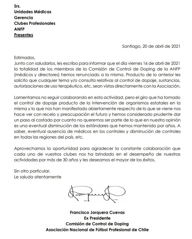 Los miembros de la Comisión de Control de Doping de la ANFP, tanto los médicos como directores, renuncian a la ANFP. A través de una carta, enviada a la gerencia de los clubes profesionales, Francisco Jorquera, el ex presidente de la agrupación, solicita que desde hoy martes 20 “cualquier tema y/o consulta relativas al control de dopaje, sustancias, autorizaciones de uso terapéutico, etc. sean vistos directamente con la Asociación”.