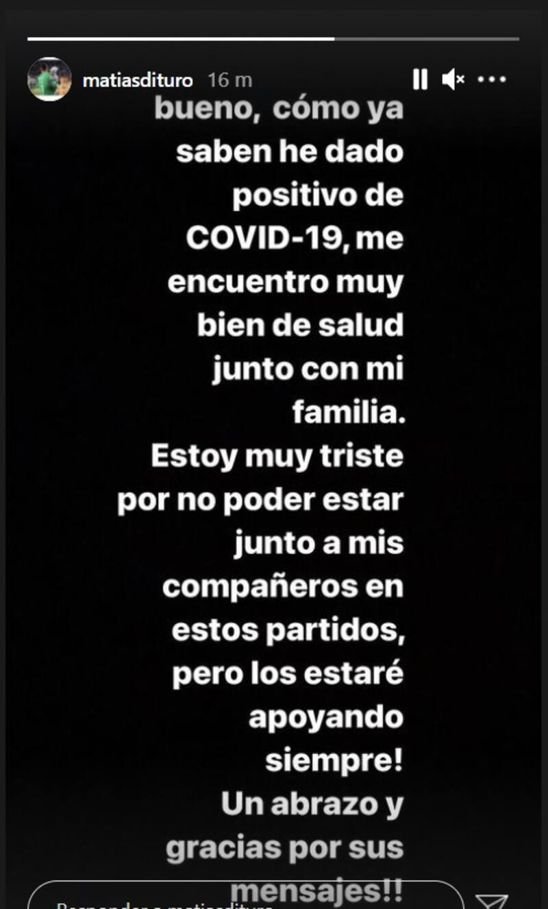El golero se refirió a su situación médica a través de su cuenta en Instagram. “Como ya saben, he dado positivo de Covid-19. Me encuentro muy bien de salud junto con mi familia. Estoy muy triste por no poder estar junto a mis compañeros en estos partidos, pero los estaré apoyando siempre. Un abrazo y gracias por sus mensajes”, posteó, mediante una historia.