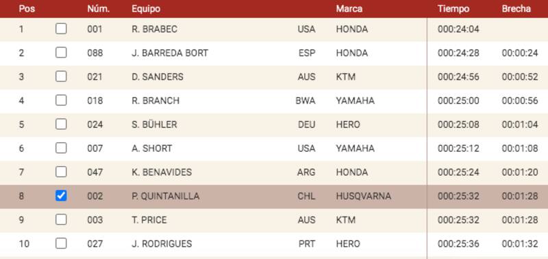 En las motos, el más veloz fue el estadounidense Ricky Bravec, compañero de equipo de Cornejo, quien cubrió los 11 kilómetros cronometrados en 6′01″. Quintafondo anotó 22″ más y Cornejo, 3′20″ detrás en los cronómetros. Estos tiempo se multiplicará por tres, de acuerdo a las bases del Dakar 2021, para generar la primera tabla de clasificaciones general de la carrera.