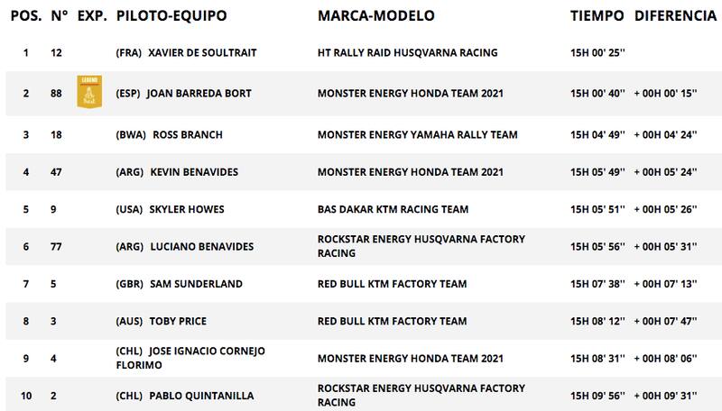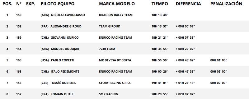 En las motos de cuatro ruedas, el mejor chileno había sido Italo Pedemonte, pero una penalización de cinco minutos lo dejó sexto, a 18′14″ del mejor del día, el argentino Manuel Andújar, y un puesto más abajo que Giovanni Enrico.