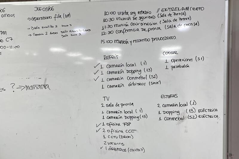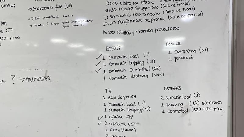 Una pizarra acrílica ubicada justo en la sala en que Ricardo Gareca ofreció la conferencia de prensa posterior al duelo daba cuenta de la distribución de los recursos. Lo llamativo, en ese sentido, era la repartición de los calefactores: dos para el camarín local (individualizado con el número uno), uno para la sala de control de dopaje y otro para los miembros de la Conmebol. Es decir, ninguno en el vestuario visitante.