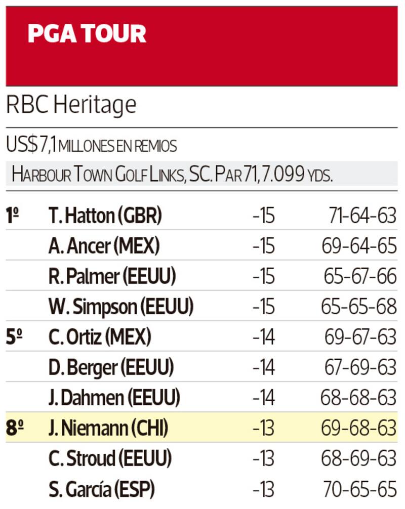 El día de la verdad es el domingo, es cuando la alegría contabiliza en los libros. Pero mientras tanto, Joaquín Niemann se concedió el mejor sábado de su vida en el PGA. El golfista nacional repitió en el RBC Heritage el -8 que consiguió en la segunda jornada del Greenbrier de septiembre pasado, que finalmente terminó ganando. Esa vez registró 62 golpes en un par 70, mientras que este día consiguió 63 en una cancha de 71 tiros, una hazaña que también había logrado en el 3M Open del año pasado, aunque nunca en el exigente e infartante penúltimo día de torneo.