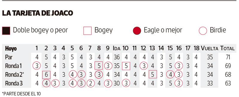 Con solo 21 años, Joaco ya ha dado muestras suficientes de que cuando está inspirado no tiene límite. Y eso explica que, en menos de 24 horas, pasara de estar luchando para sortear el corte a instalarse en la discusión por alcanzar su segunda corona en el máximo circuito del golf mundial. En la mañana de hoy mostró una impresionante racha de siete birdies en los 10 primeros hoyos (ver tarjeta), donde no tuvo fisuras, algo que también se notó en las nueve banderas finales, donde le restó un golpe a la 16. En síntesis, el mejor recorrido del día, igualado con otros cinco competidores.
