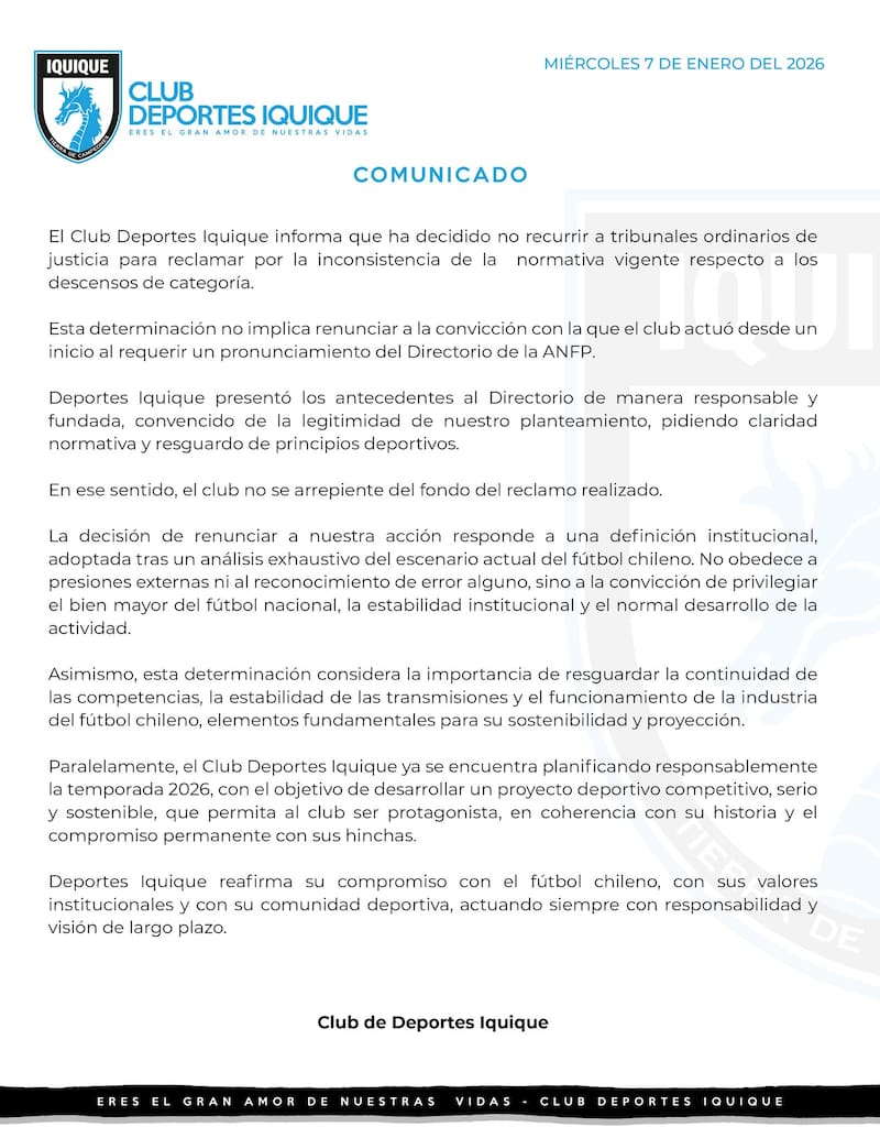 “El Club Deportes Iquique informa que ha decidido no recurrir a tribunales ordinarios de justicia para reclamar por la inconsistencia de la normativa vigente respecto a los descensos de categoría”, comienza diciendo en un comunicado publicado esta noche. “Esta determinación no implica renunciar a la convicción con la que el club actuó desde un inicio al requerir un pronunciamiento del Directorio de la ANFP”, añadió.