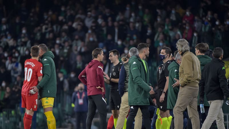 El acta dice: “Se ha suspendido el partido el día 15/01/2022 a las 23:46, motivado por (incidentes del público): Tras la consecución del gol del Real Betis en el minuto 39, se lanzó una barra hueca de aproximadamente 50 cm de PVC. Dicho lanzamiento se realizó desde el fondo de la derecha según salimos de vestuarios, donde se encontraban seguidores que portaban camisetas, bufandas y banderas del equipo local. Dicha barra impactó en la cabeza del jugador N°8 del Sevilla, Joan Jordán Moreno, cayendo al terreno de juego, necesitando asistencia médica. Ante los hechos descritos decidimos suspender el encuentro en virtud del artículo 240 apartado 2c del Reglamento General de la RFEF... El resultado en dicho momento era de 1-1 y el encuentro debería de reanudarse con un saque inicial a favor del Sevilla y el tiempo adicional que añadiríamos hasta dicho momento era de 4 minutos”.