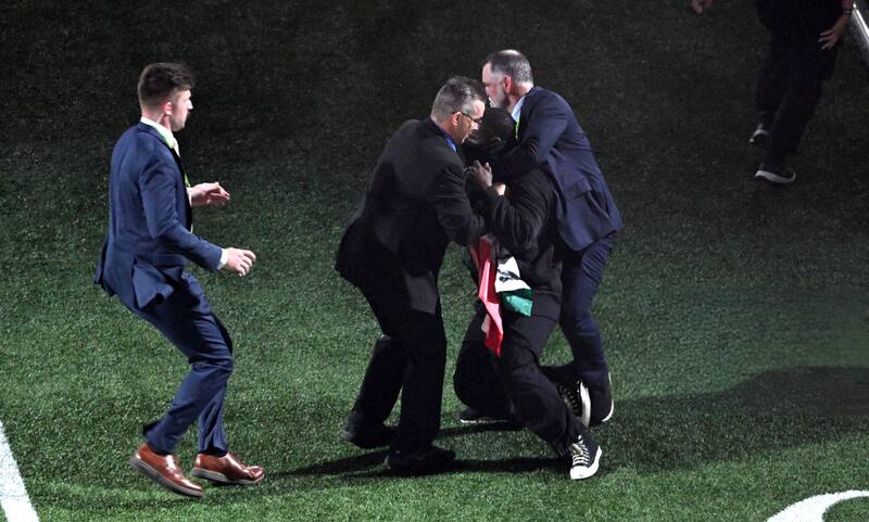 Hasta que finalmente los agentes de seguridad intervinieron para detener al hombre y retirarlo del campo. Aparentemente, quería visibilizar las problemáticas que atraviesan ambas naciones en los últimos años.